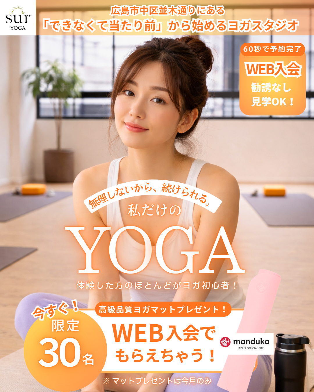 《プラン内容》 ・レッスン受け放題(両店舗スタジオ+オンライン) ・マットBOX込み ・Director class OK ・水素水(三川町店) ・バスタオル1枚(三川町店) ・アメニティ(三川町店)